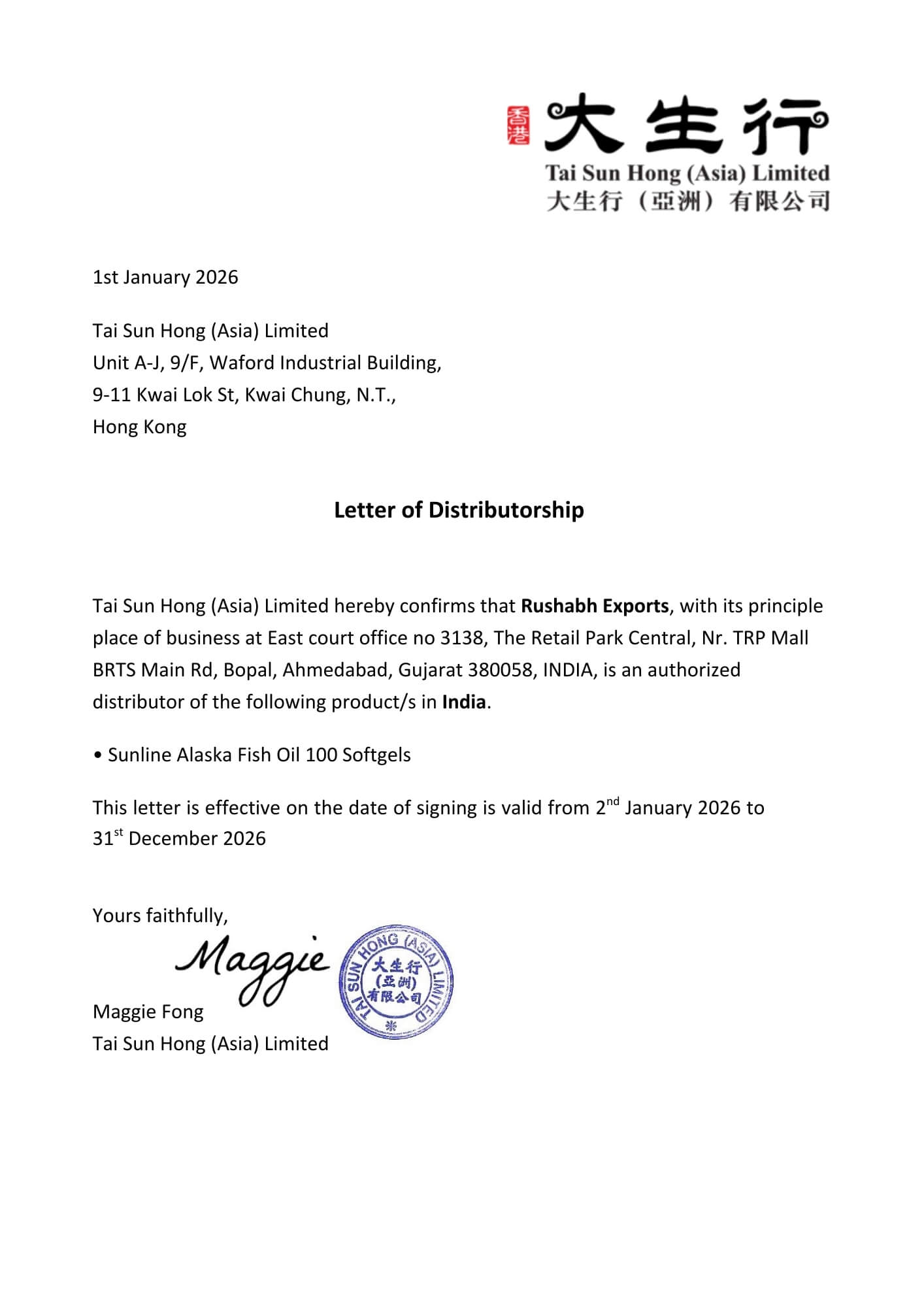 Rushabh Exports (MuscleKart™) is an exclusive authorised importer of Sunline® Alaska Deep Sea Fish Oil in India.